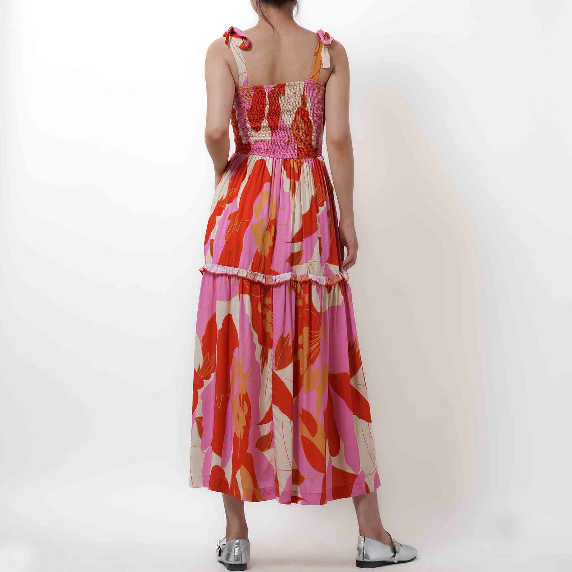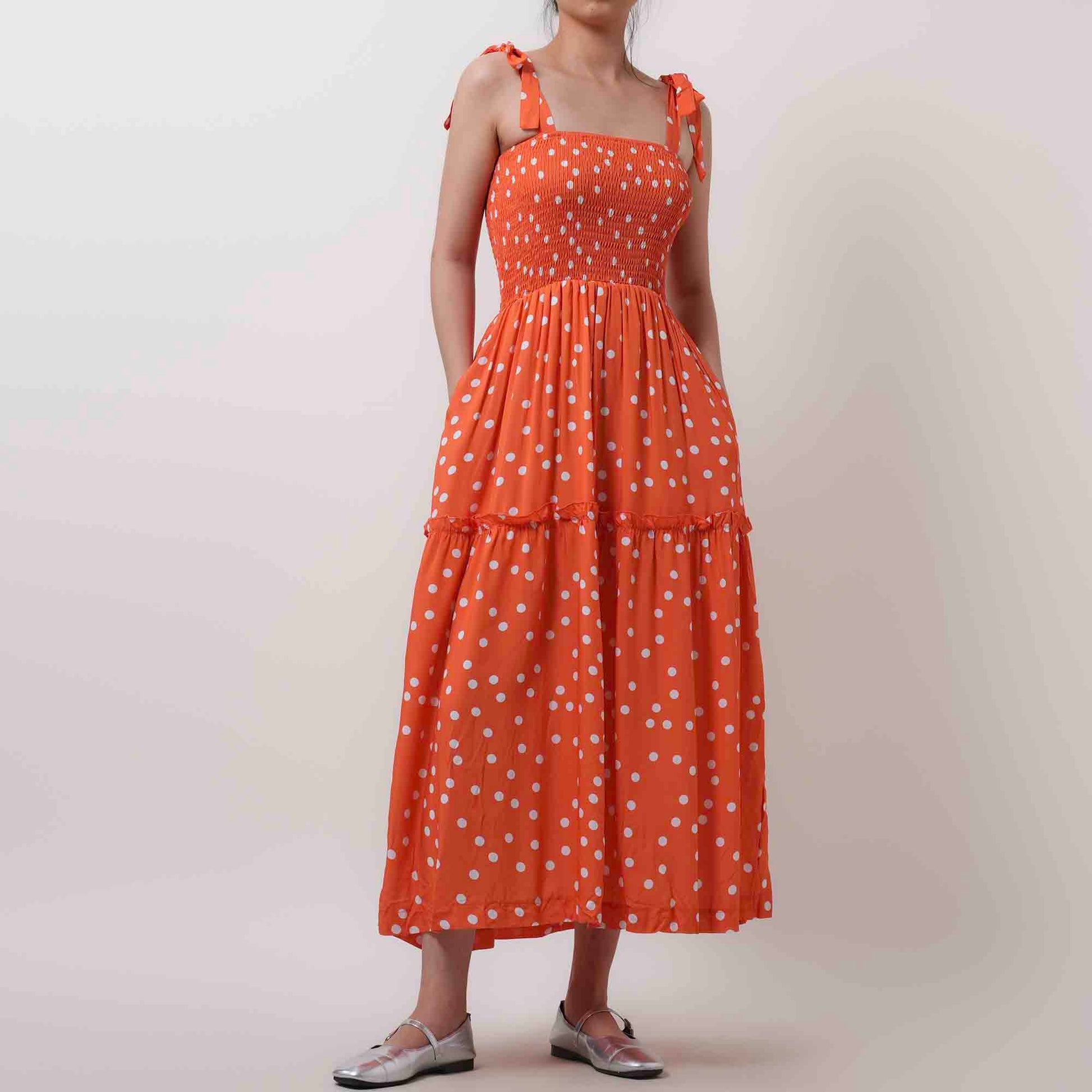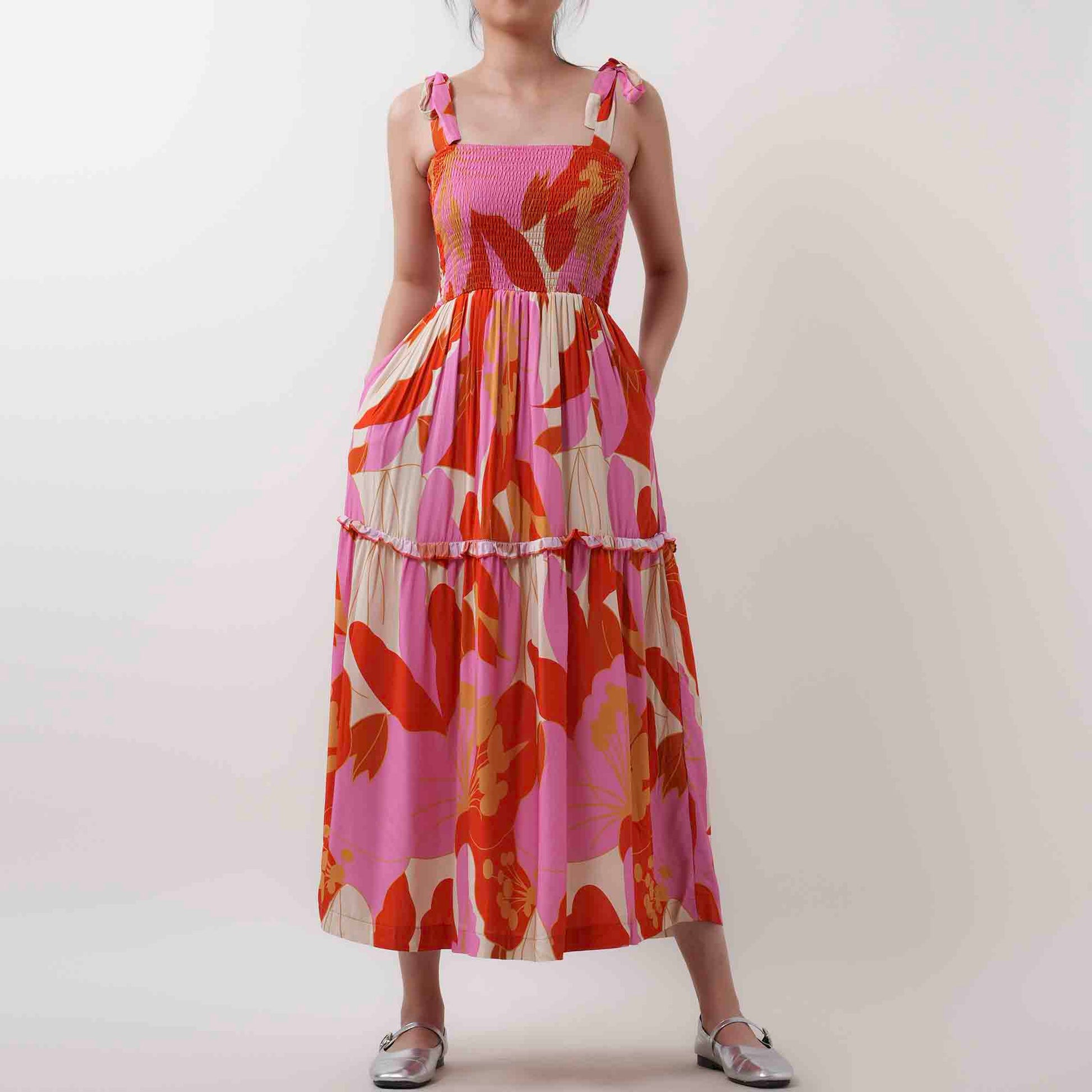 Embrace effortless style with this flowy rayon maxi dress, featuring a vibrant floral/dot digital print that softens beautifully after first wash. The adjustable shoulder ties and smocked top create a customizable fit, while the 100% polyester lining ensures smooth coverage and comfort.