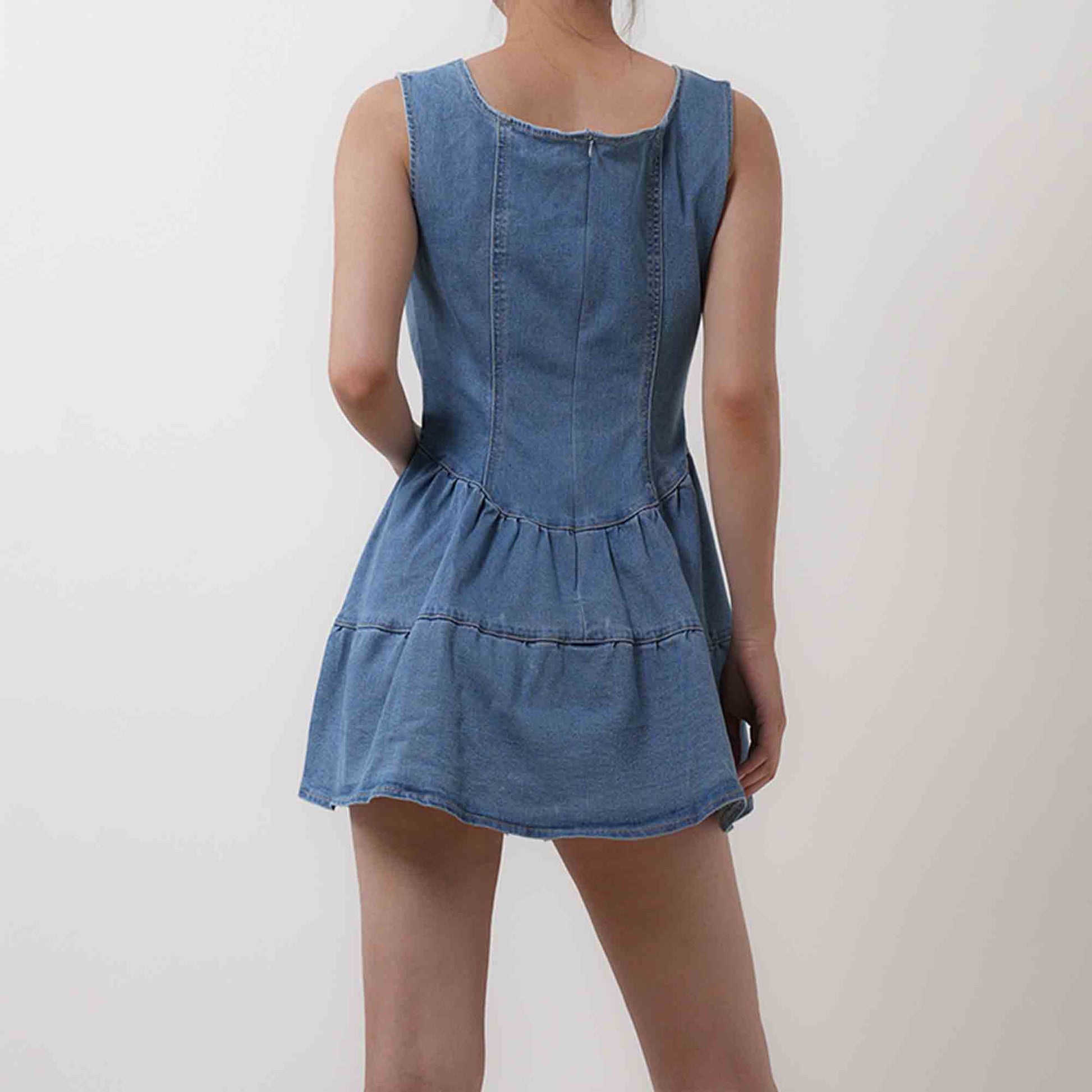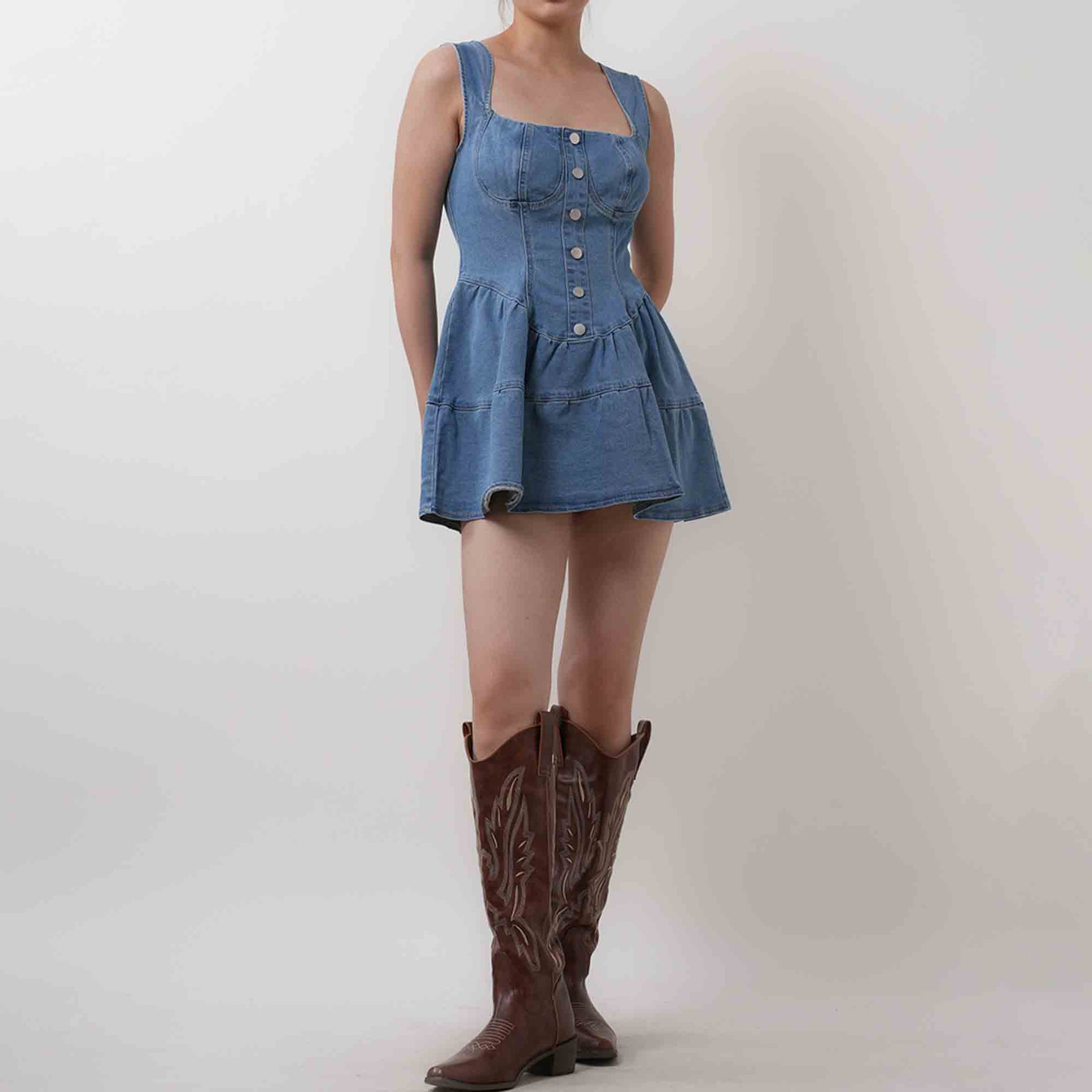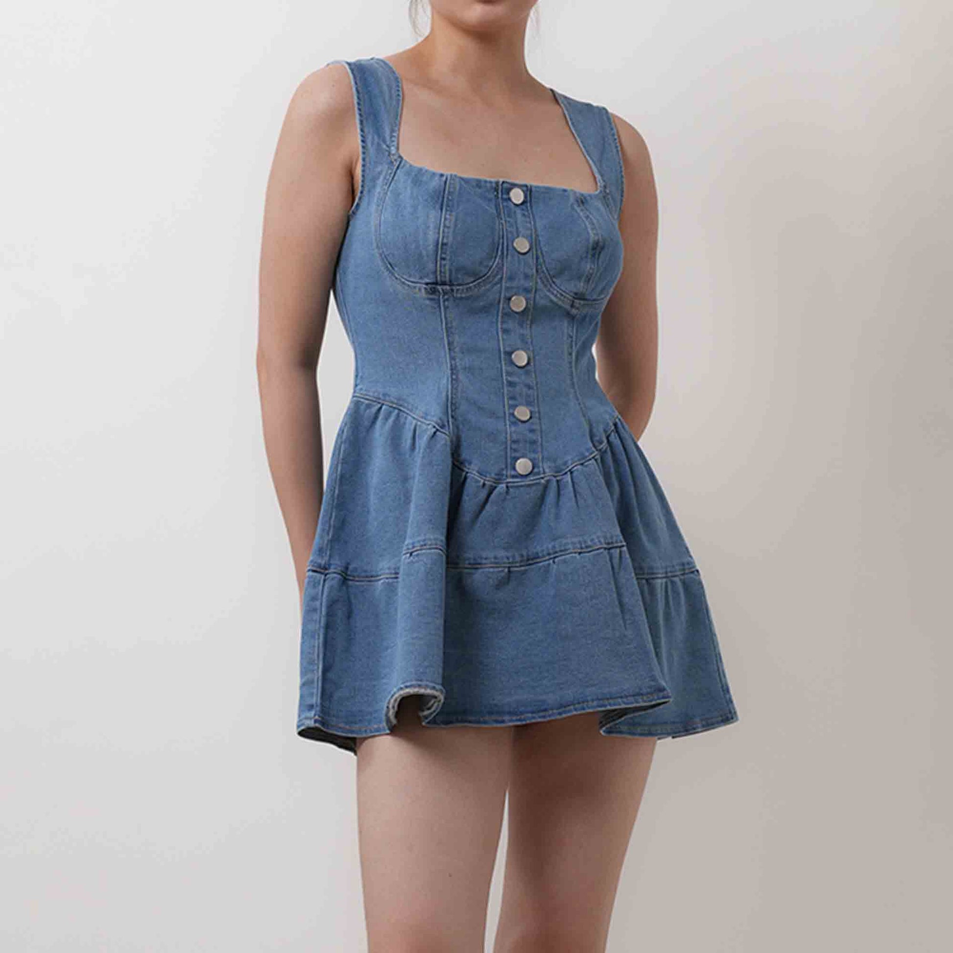 Make a stylish statement with this sleek mini dress, featuring a modern square neckline and two thin shoulder straps for a flattering silhouette. The denim blue hue (as shown on model wearing size S) is elevated with eye-catching silver metal button details at the front and a convenient back zip closure.