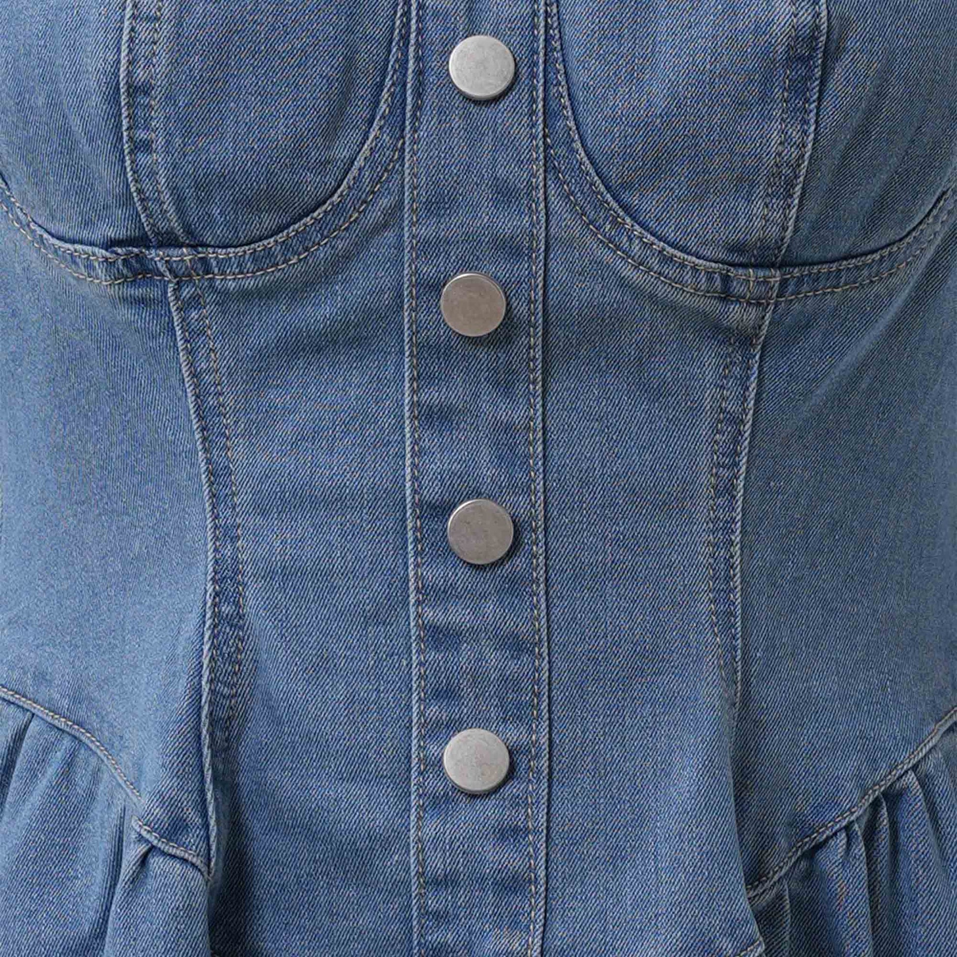 Casual Denim Blue Mini Dress - Strappy Sleeveless with Silver Button Details Cherie Code