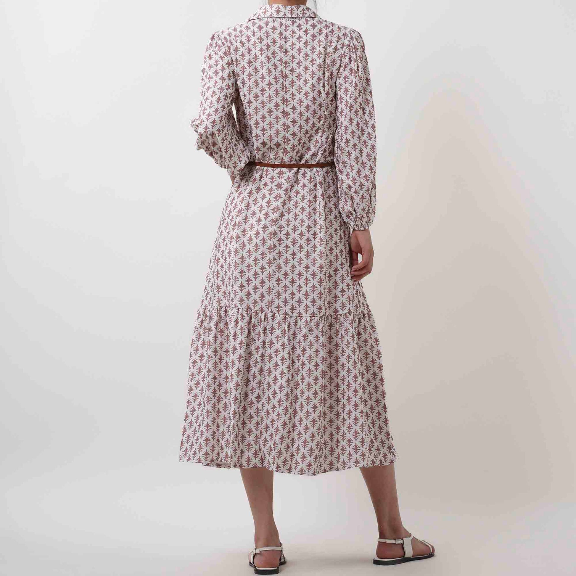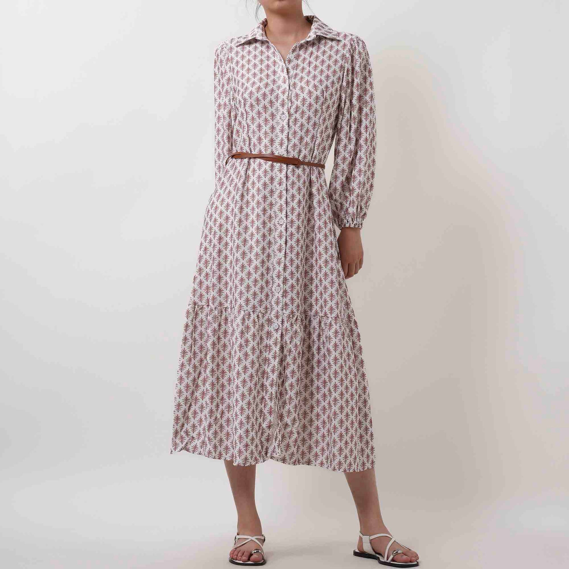 This elegant viscose/polyester midi dress offers effortless style with its flowing silhouette and included belt for a customizable fit. The long sleeves and knee-length cut make it perfect for transitional weather.