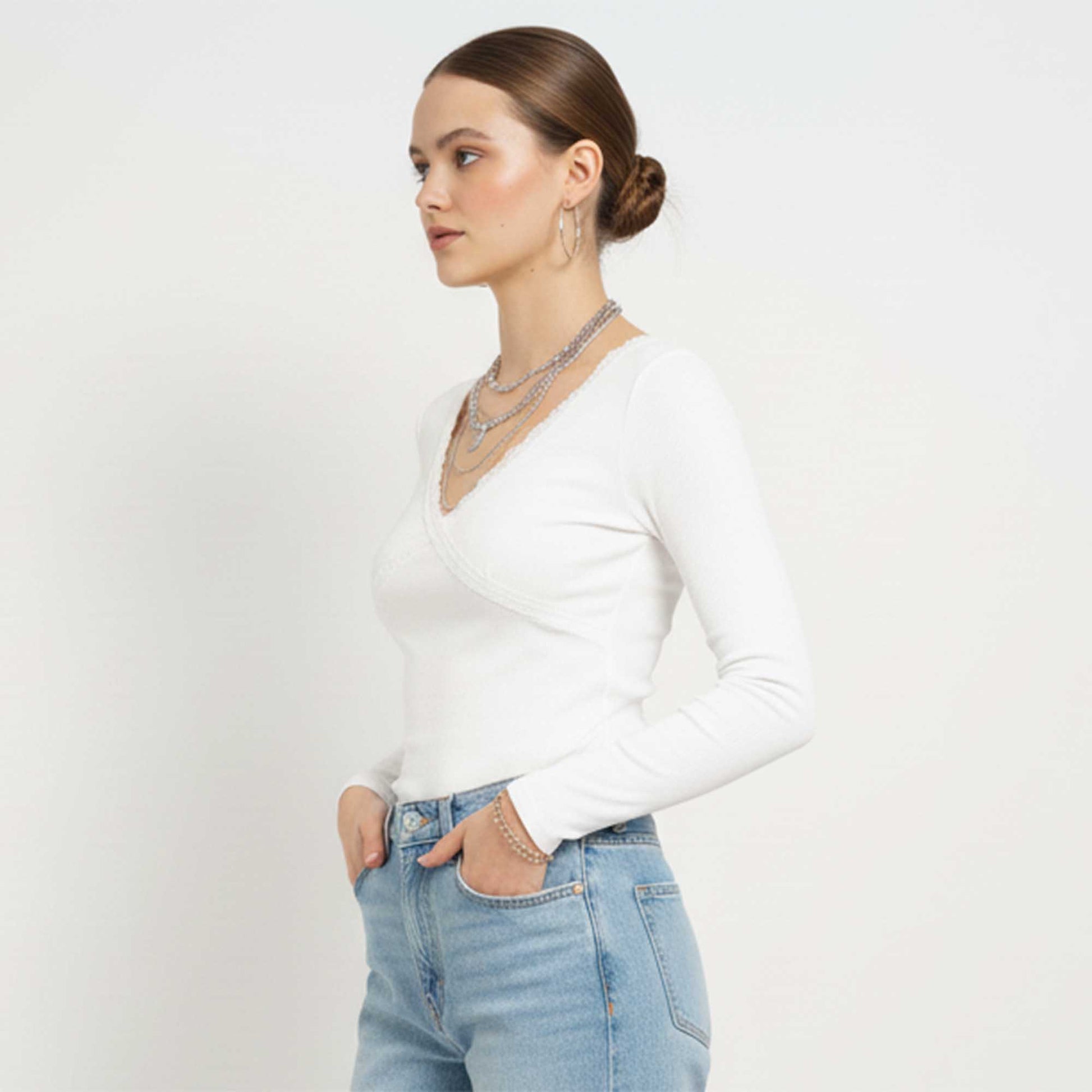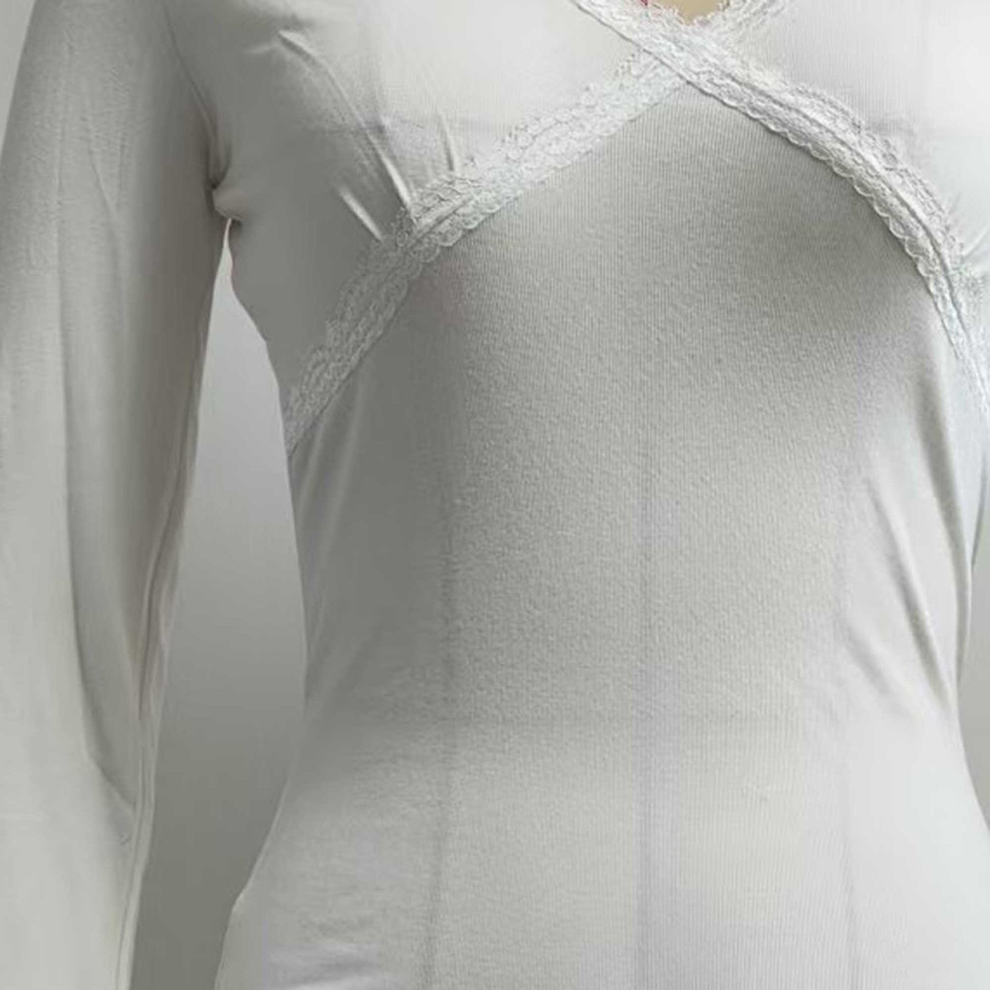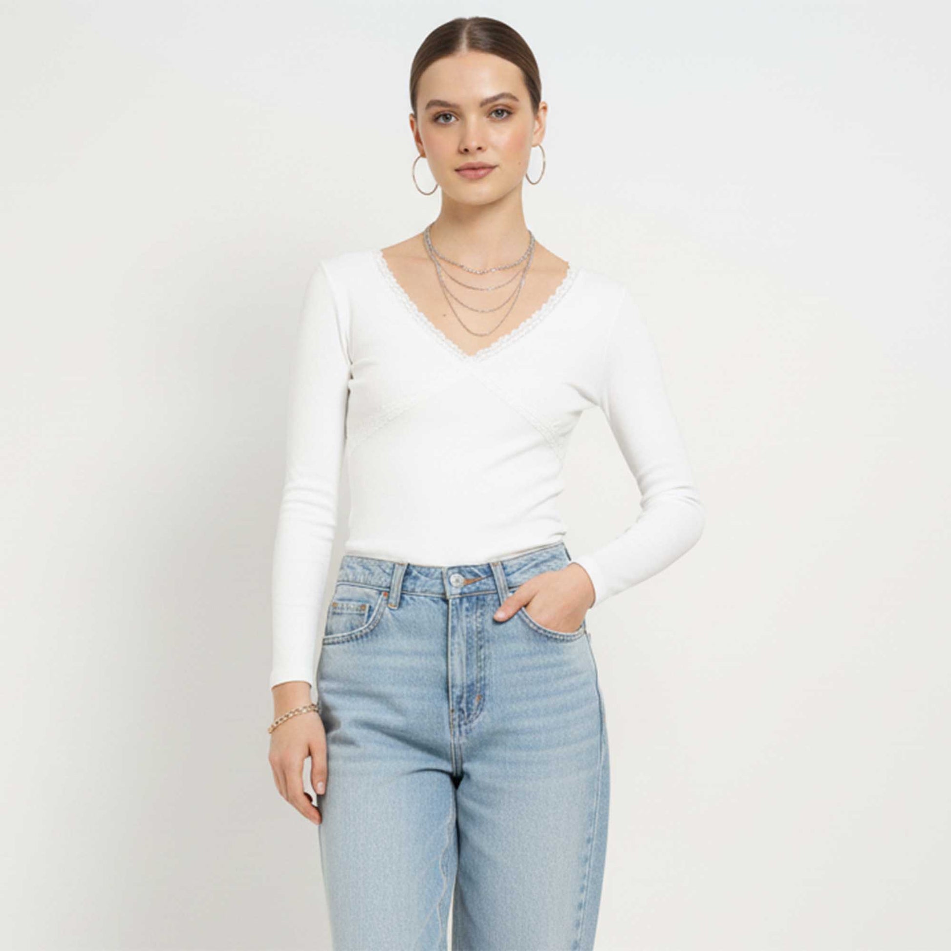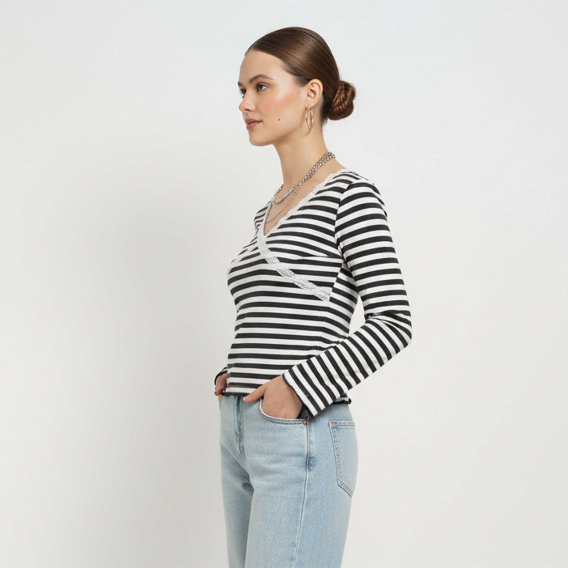 V‑neckline with lace trim adds a refined styling touch to a casual piece