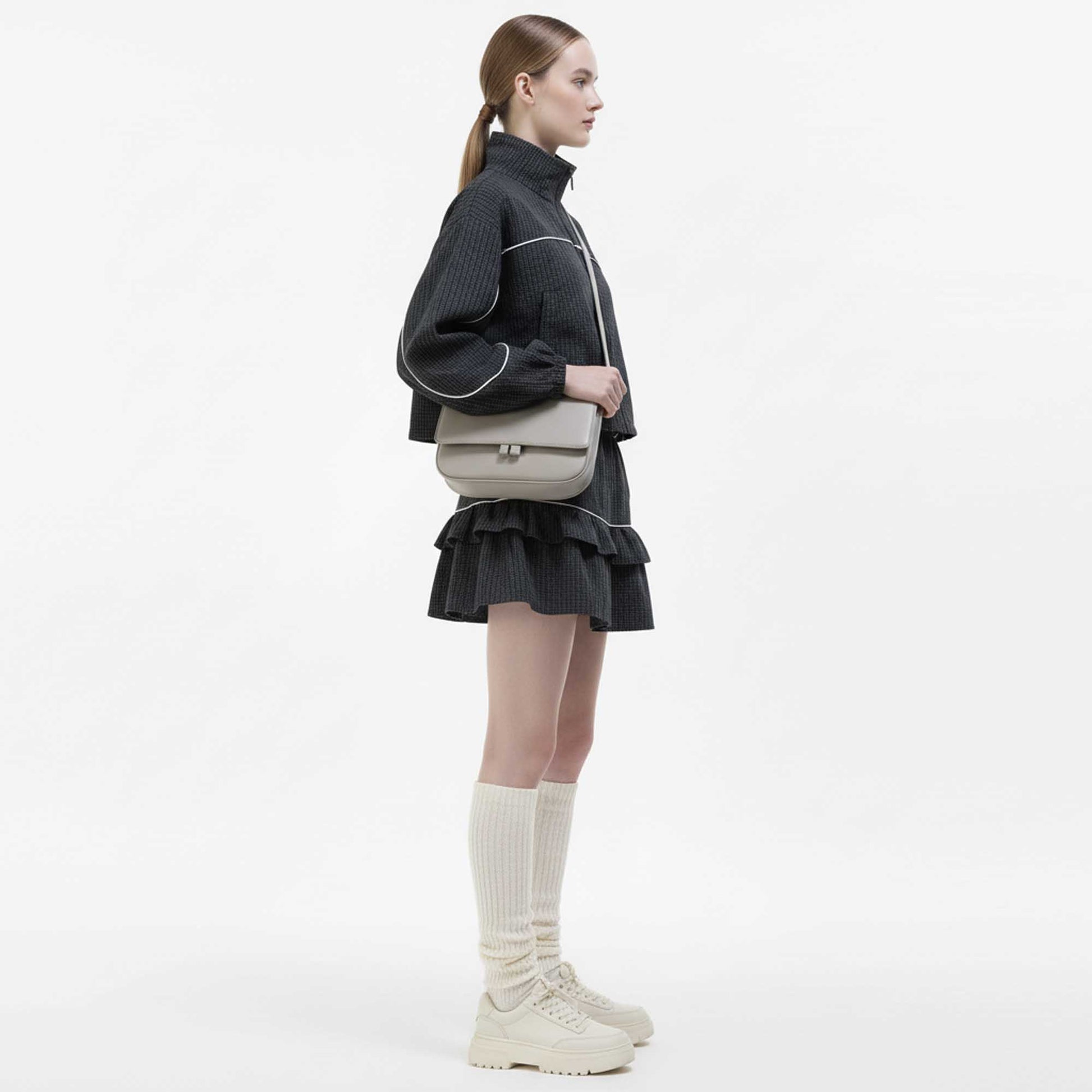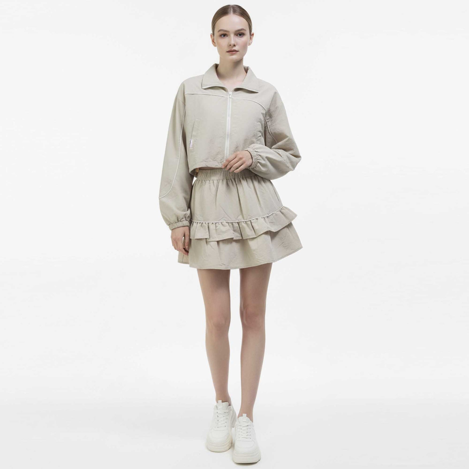 Step into versatile style with the Cherie Code Plaid Patchwork Jacket & Tiered Ruffle Skort Set. Crafted in smooth polyester with zero stretch for structure and form, this two‑piece set pairs a cropped stand‑collar zip‑front jacket with a plaid patchwork motif with a matching tiered ruffle skort. With its modern silhouette and playful detailing, it’s the perfect outfit for day‑to‑night transitions or chic weekend wear.