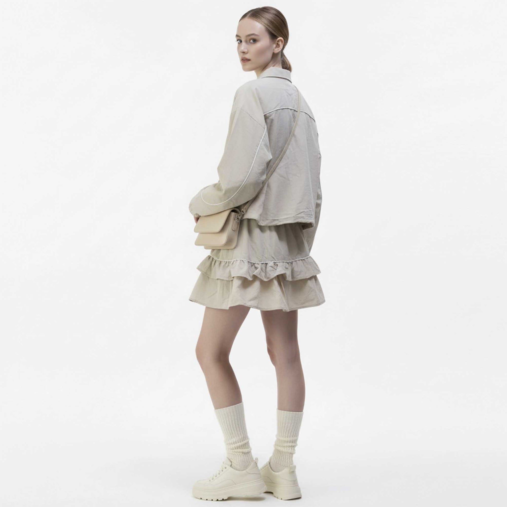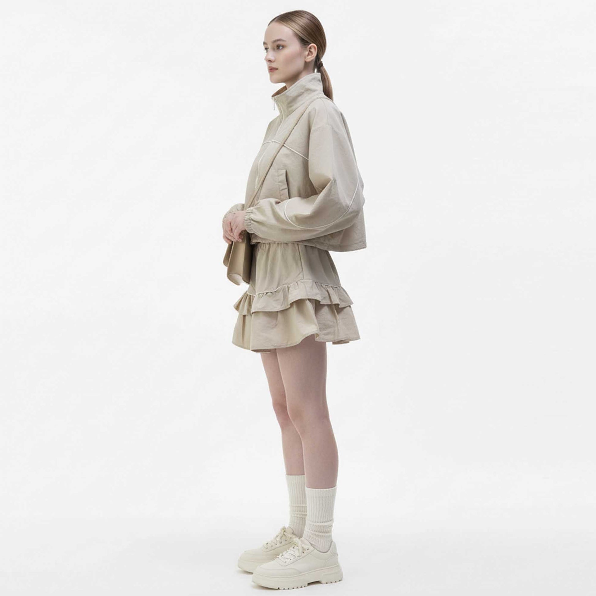 Structured polyester fabric ensures a crisp silhouette and layered ruffle skort adds feminine movement.