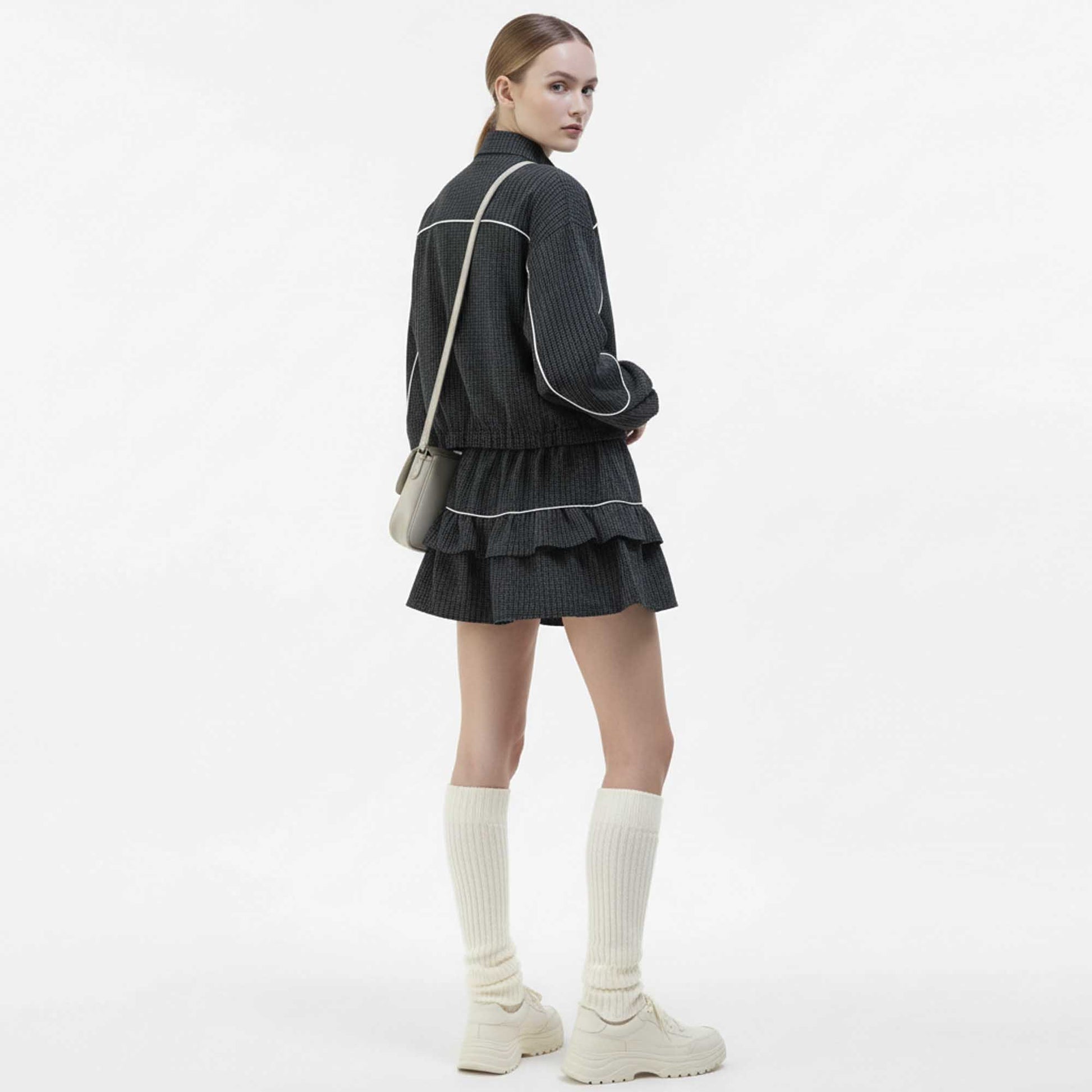 Cherie Code Women’s Plaid Patchwork Jacket & Tiered Ruffle Skort Set – Zipper Front, Stand Collar Casual Two‑Piec