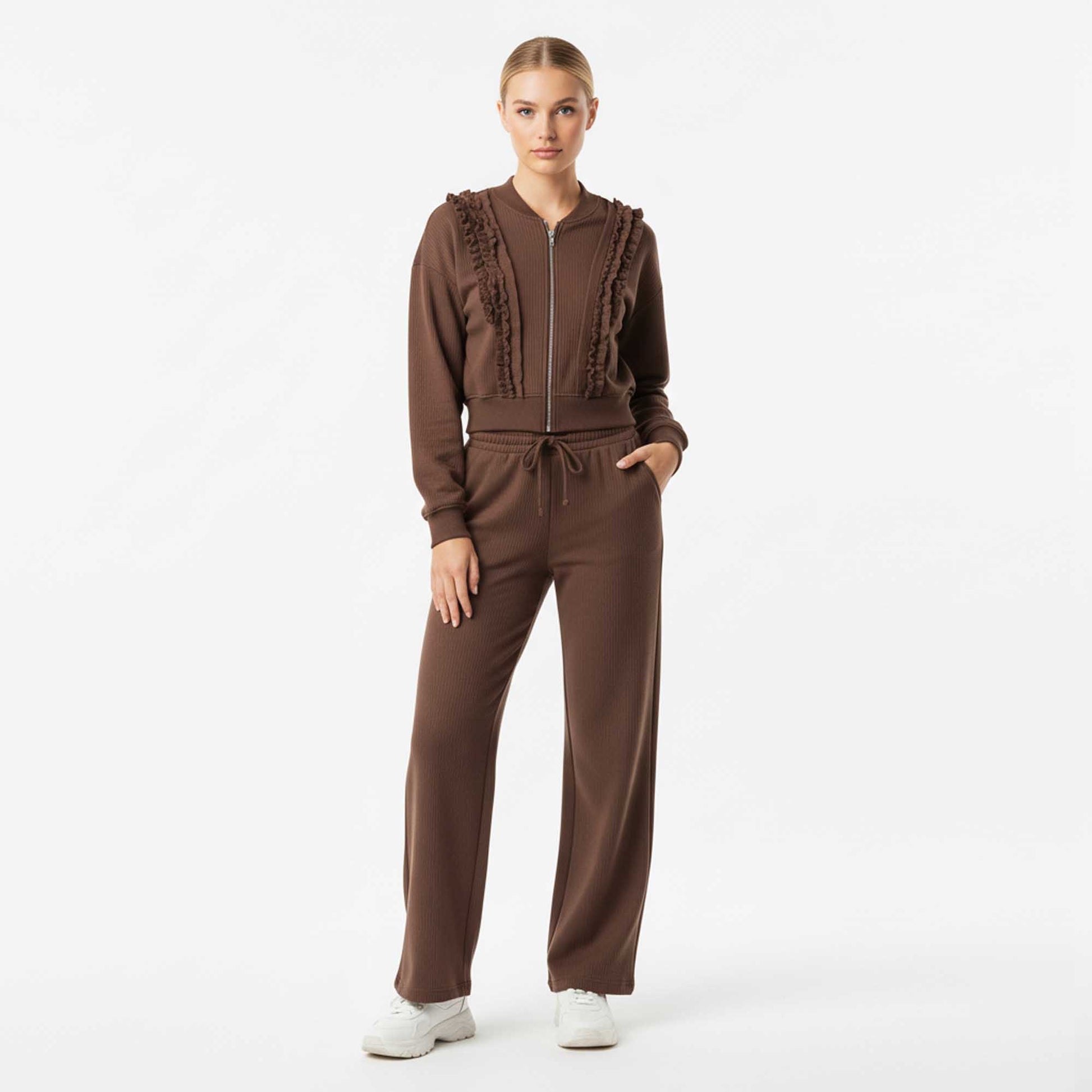 Meet your new go‑to for effortless style and comfort— the Cherie Code Two‑Piece Active Lounge Set. This coordinated set features a sleek zip‑front crop jacket with subtle ruffle detailing and a comfortable wide‑leg pant with an elastic waistband. Crafted from a durable blend designed for everyday movement and style, it’s perfect from errands to relaxed weekends.