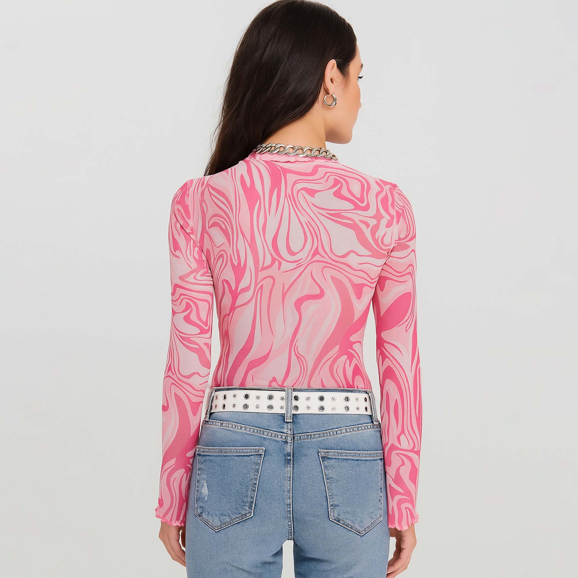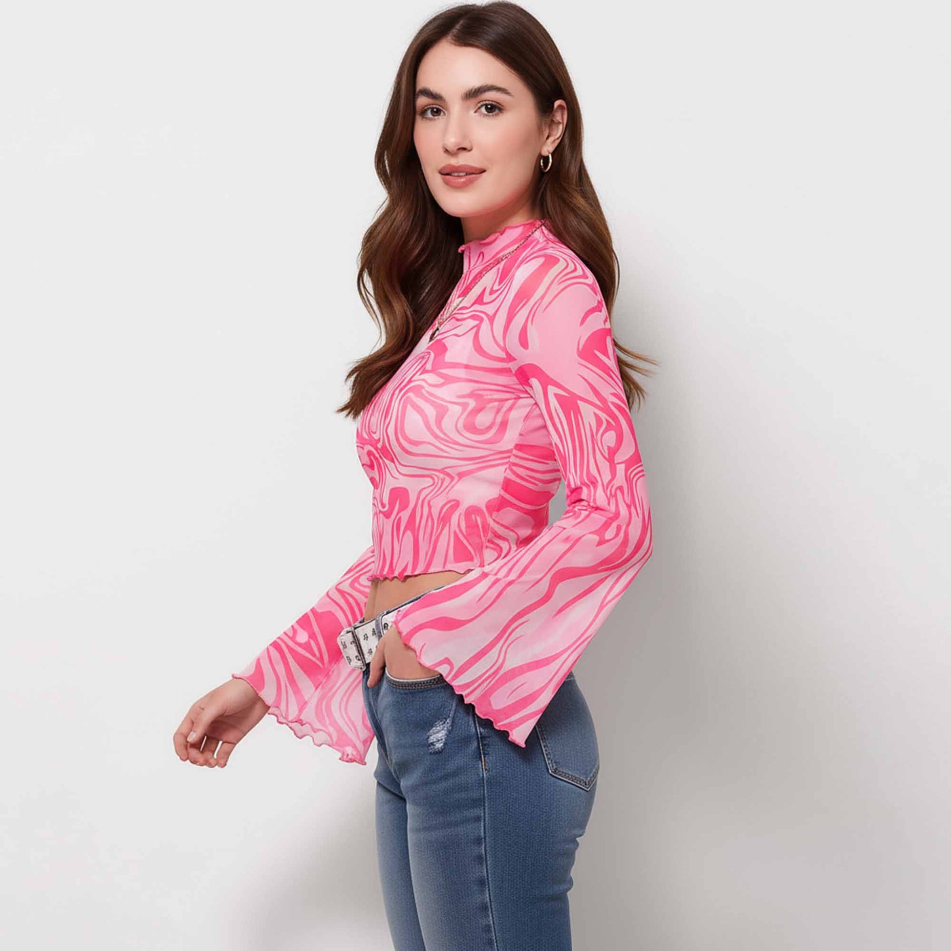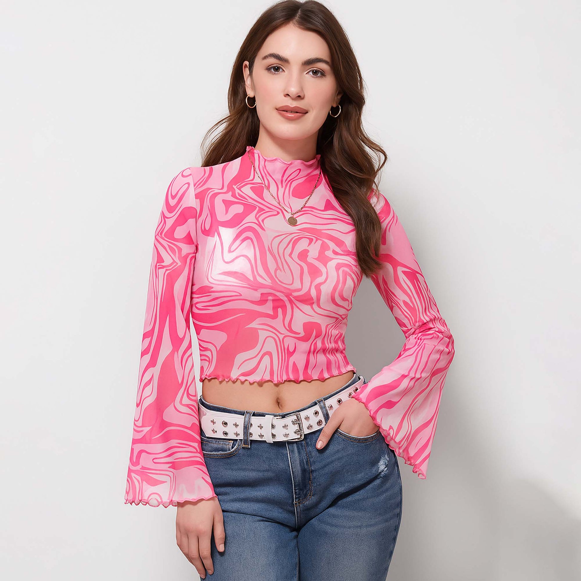 Cherie Code Women's Pink Printed Mesh Flare Sleeve Crop Top – Stretch Slim Fit Turtleneck Blouse