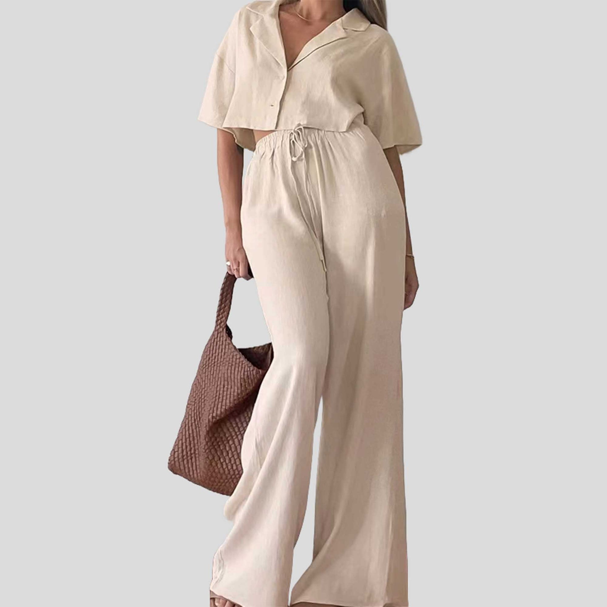 Women Set with Button-Down Top & Elastic Waist – Short Sleeve, Wide Leg, Polyester-Cotton Blend Cherie Code
