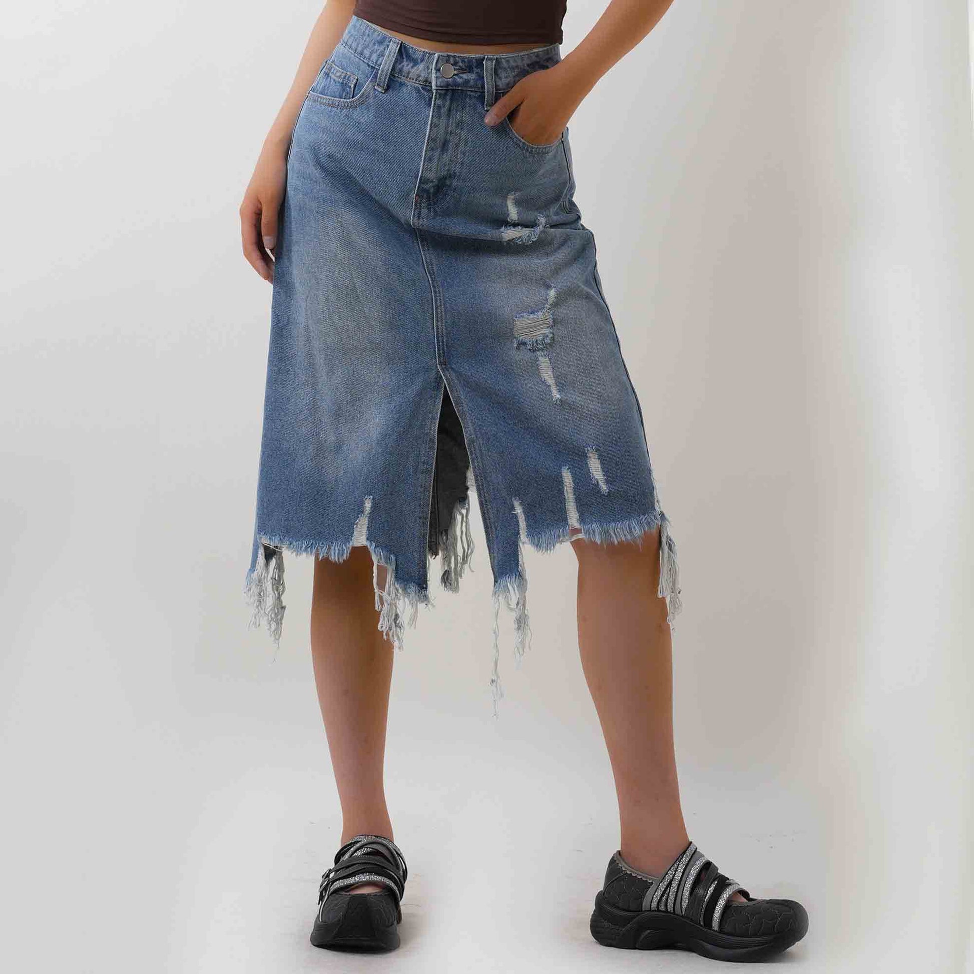Women's Classic Distressed Denim Midi Skirt - Button & Zip Closure with Functional Pockets Cherie Code