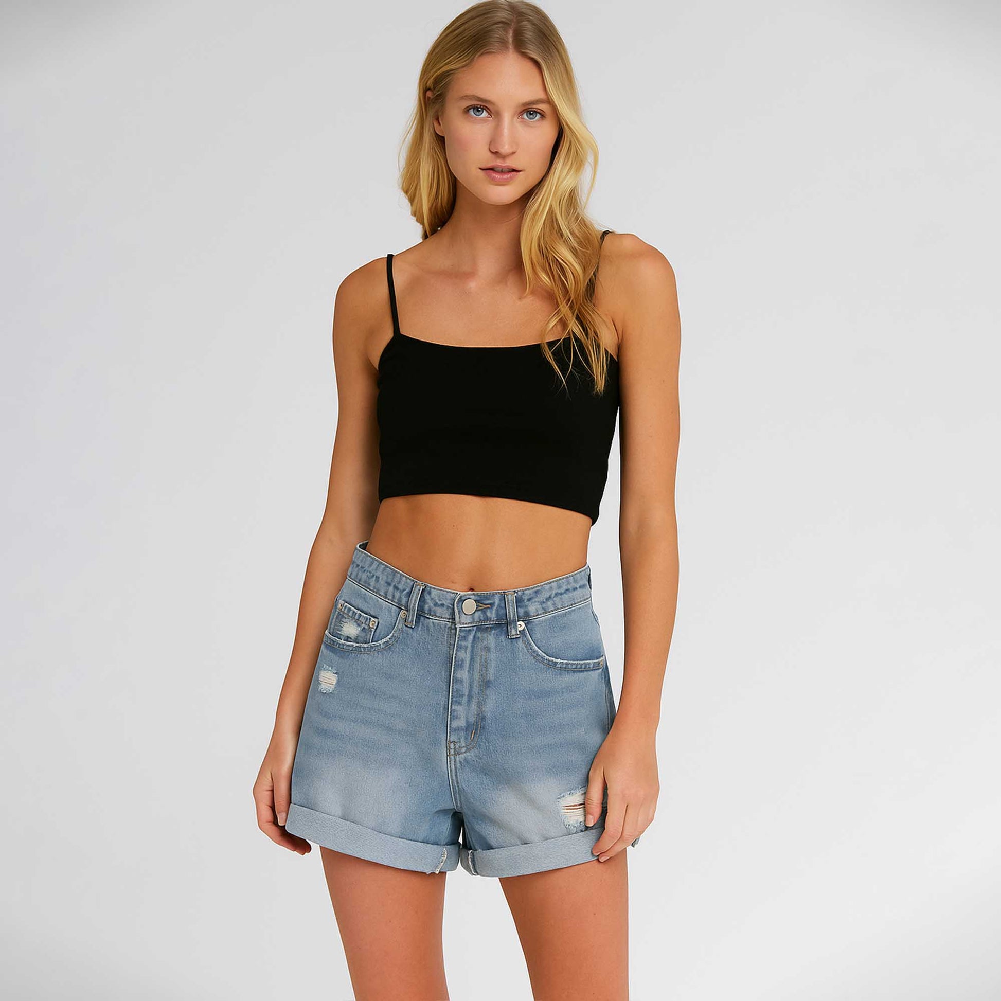 Women's Slim Fit Distressed Denim Shorts - Rolled Hem with Classic 5-Pocket Cherie Code