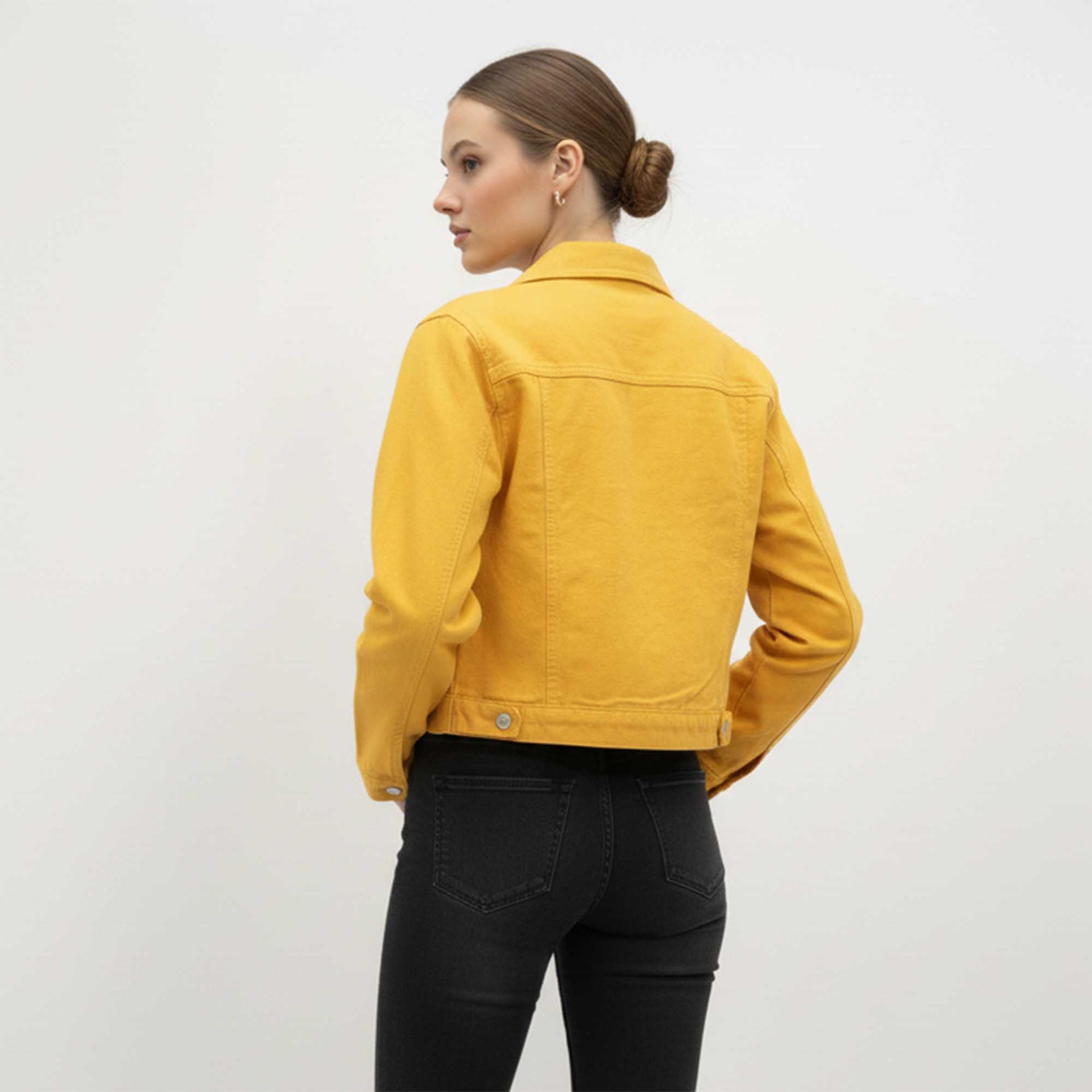 Brighten up your wardrobe with the Cherie Code Women's Solid Color Denim Jacket, crafted from a durable polyester-cotton blend for comfort and longevity. Featuring a classic turndown collar, button front, and two chest pockets, its vibrant yellow hue adds a modern twist to timeless denim—perfect with jeans, skirts, or dresses.