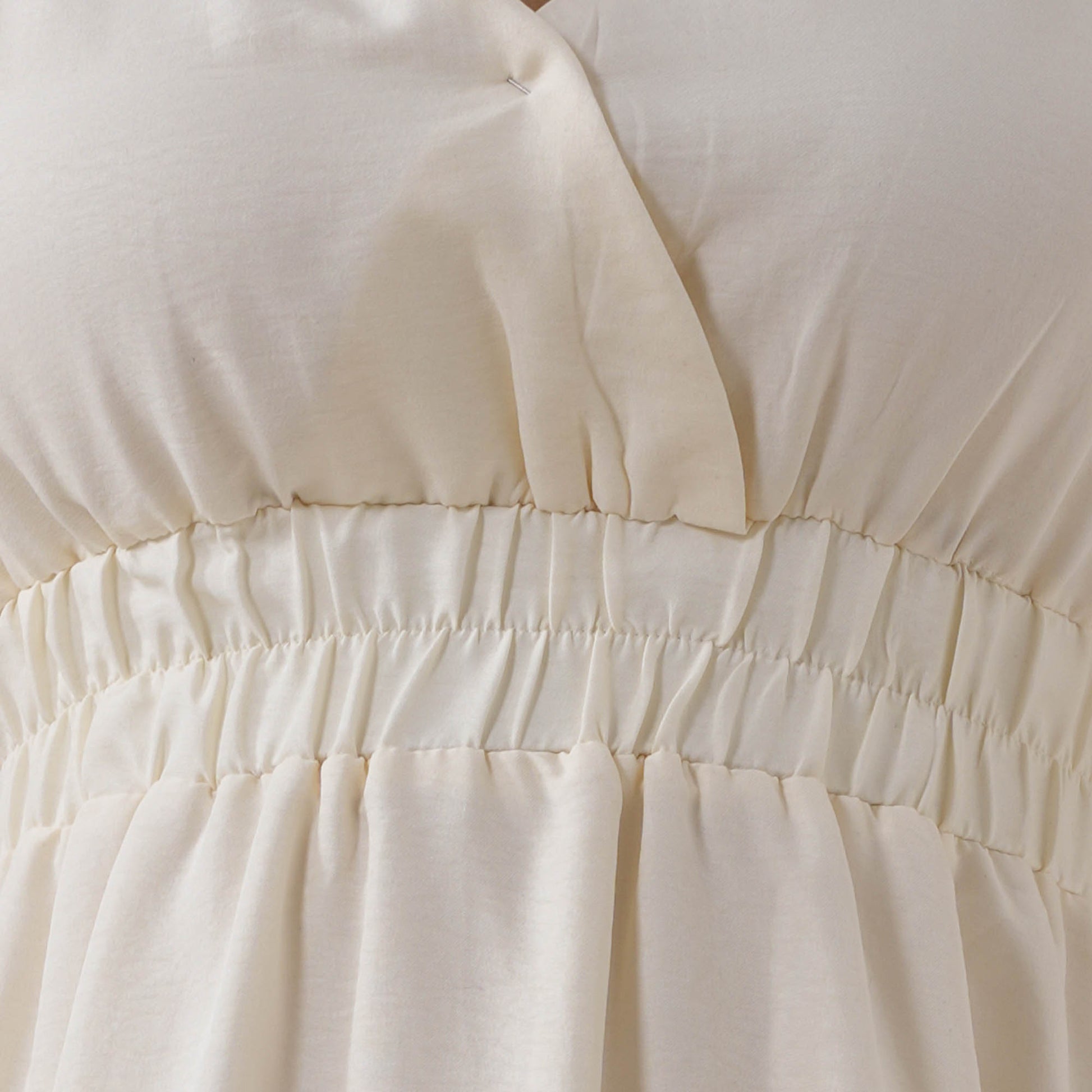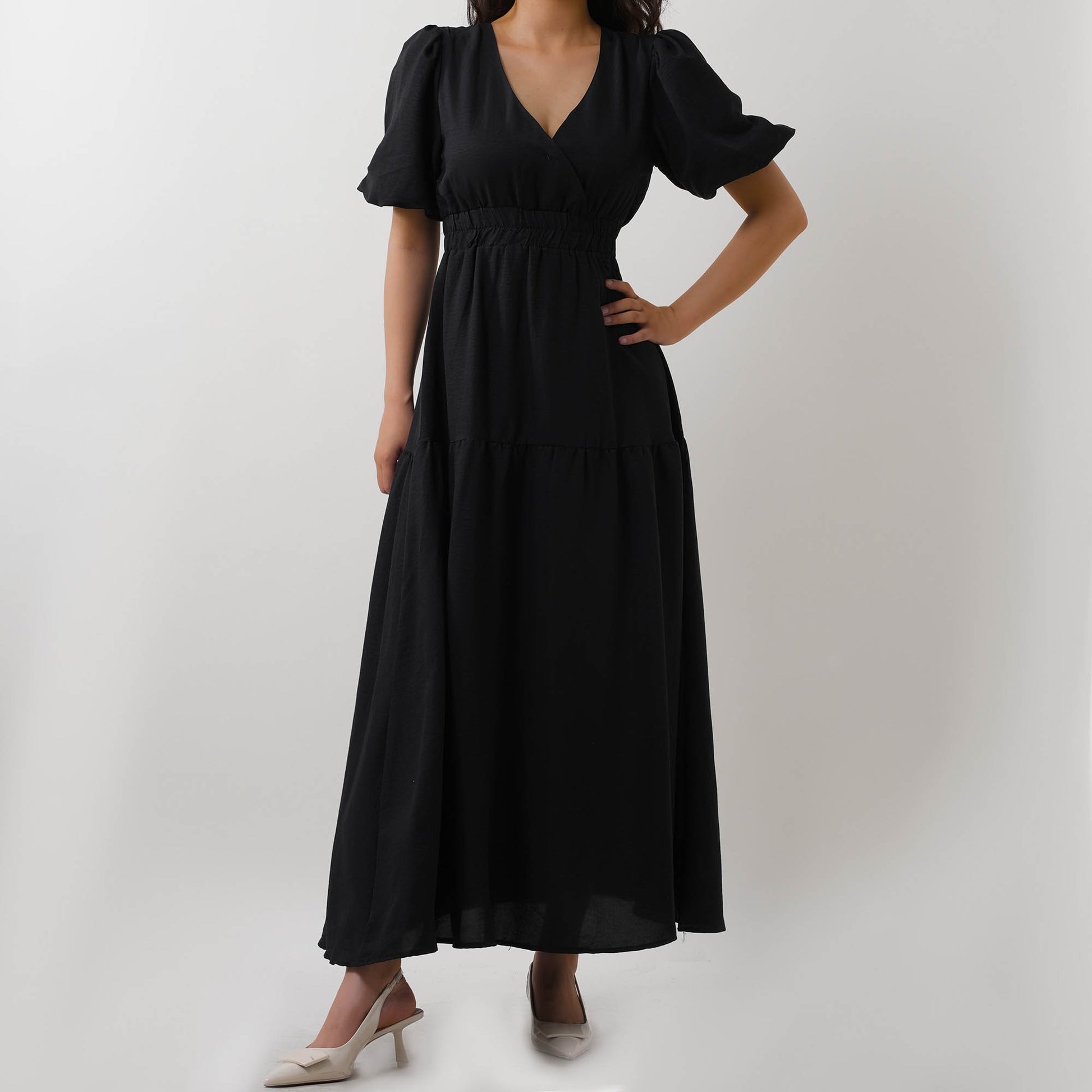 Women's V-Neck Midi Dress - Short Bubble Sleeves & Elastic Waist Casual Dress Cherie Code