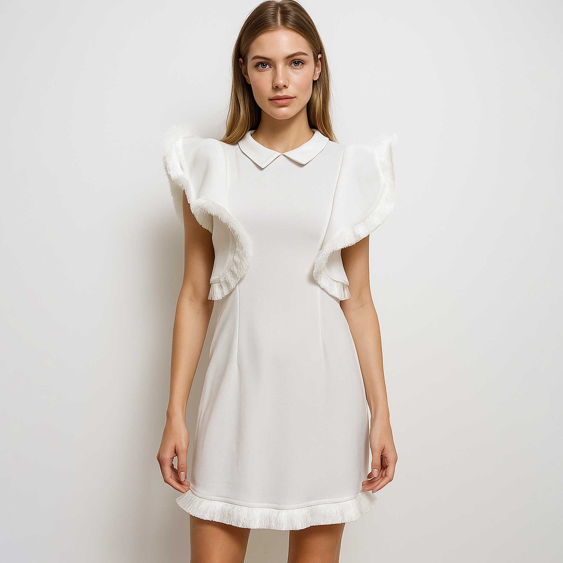 Women's White Fringed Sleeve Mini Dress – Flounce Detail by Cherie Code